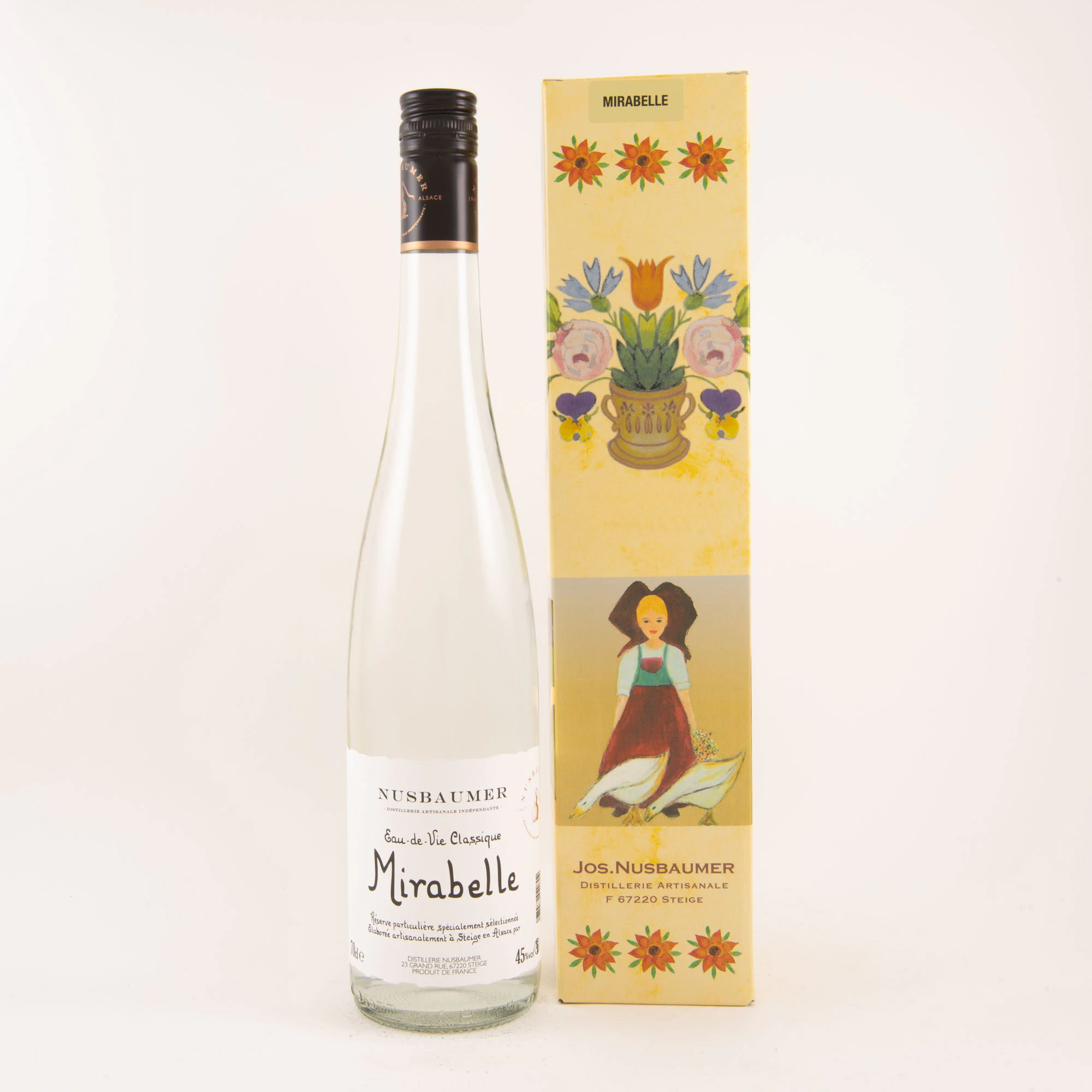 L'Eau-de-Vie de Mirabelle Jos Nusbaumer nécessite 18 kg de cette délicieuse prune jaune pour fabriquer un litre d'alcool. Vieillie de 6 à 12 mois en fûts de chêne épuisés pour éviter la coloration, c'est un régal de fruit et de finesse. Depuis 1947, la famille Nusbaumer perpétue la tradition familiale de l'art de la distillerie dans le plus grand respect de techniques ancestrales jalousement gardées.