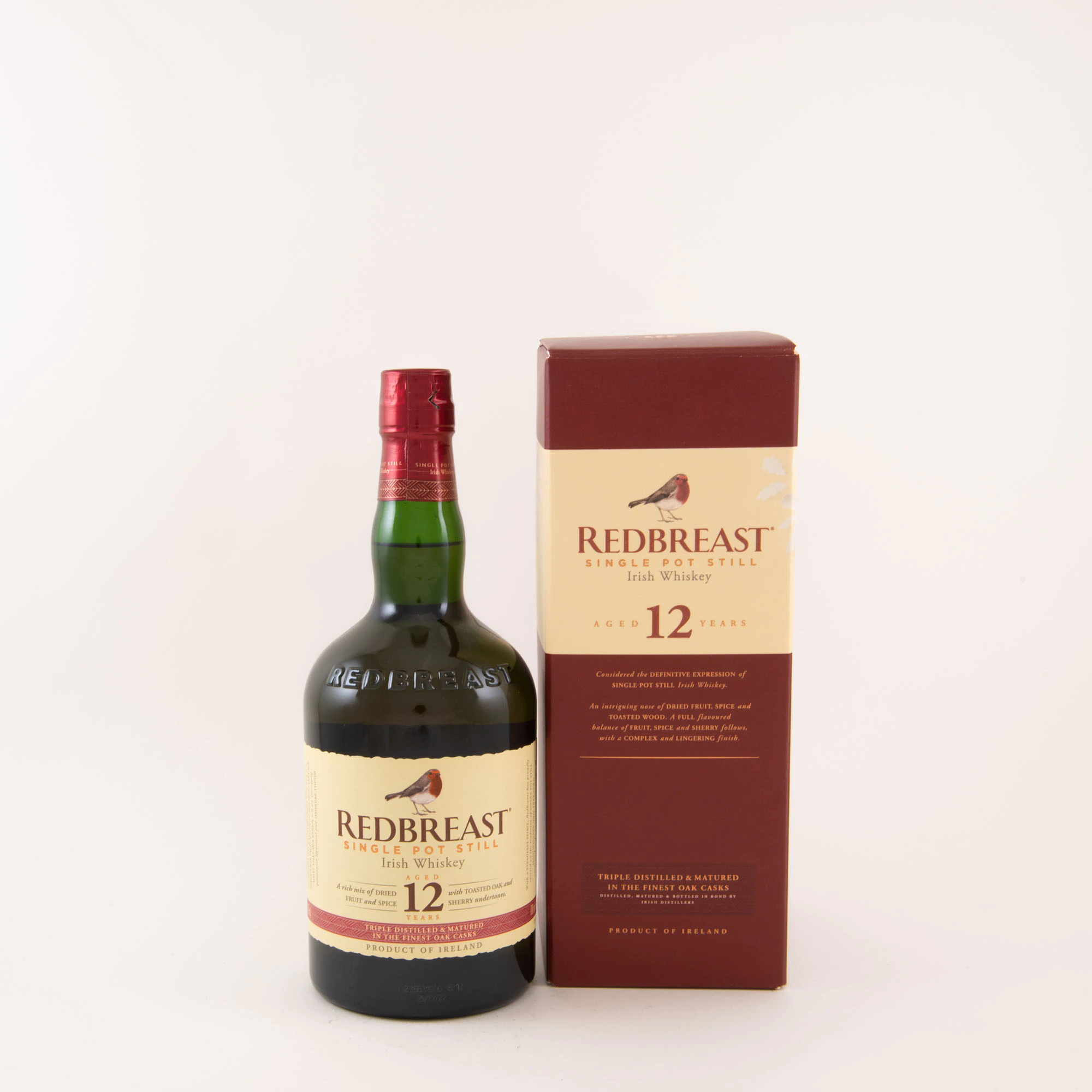Le Redbreast 12 ans 40° vol. est élaboré à partir d'un mélange à parts égales d'orge maltée et d'orge non maltée (whiskey pure pot still). Ample, expressif, il s'offre avec un nez de fruits rouges et d'épices douces. Sa bouche, bien riche, donne place au cassis, aux fruits mûrs, à la praline. Avec sa finale bien longue, il laisse le temps d'apprécier ses parfums de fruits confits et de poire mûre.